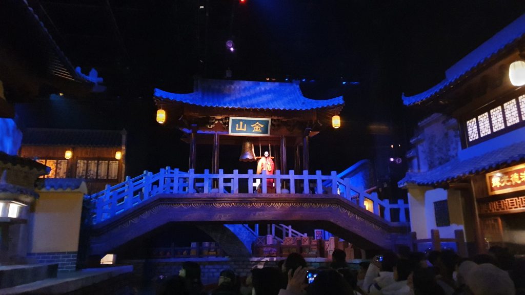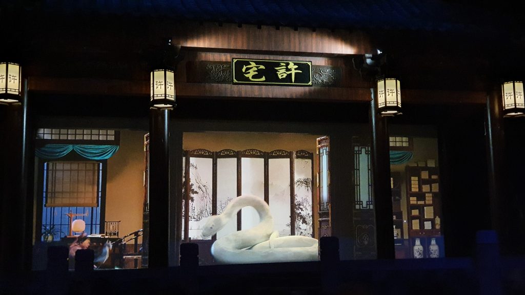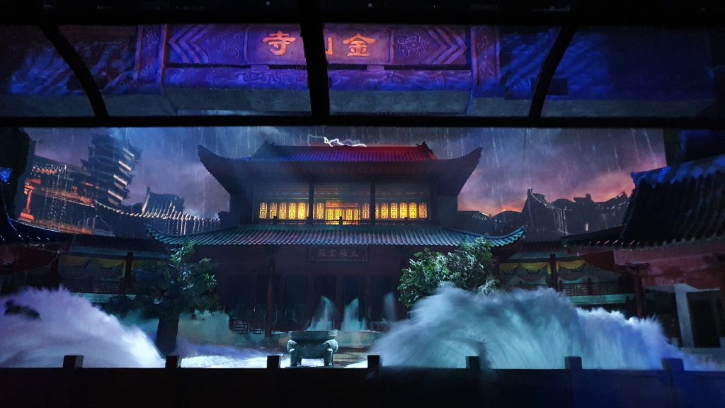 The storyline concerns the Legend of the White Snake, one of China’s ‘four great folktales’ (all of which are represented at these parks in one form or another). The basic premise is an altercation between a jealous terrapin spirit/Buddhist monk named Fa Hai and a white snake spirit/lady called Bai Suzhen. There’s a lady green snake too. Complicated right? I can’t really do the thing justice so I’d recommend a bit of further reading if it interests you.
