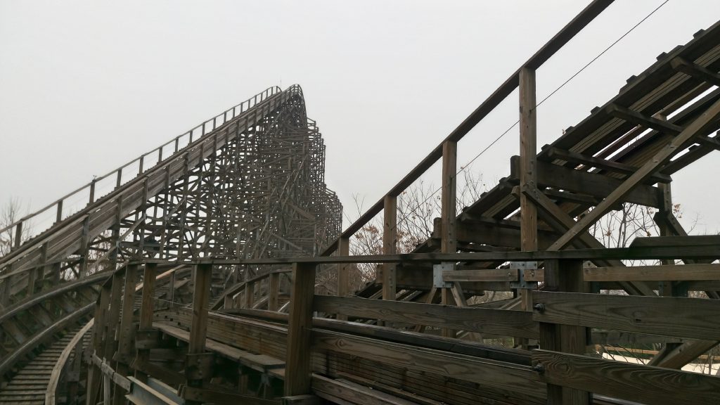 A major advantage of making rollercoasters out of wood is the sensation with which they ride. This varies hugely from those which are glass smooth, indiscernable from steel and often criticised by enthusiasts for that fact (me included), to coasters so violently jarring and rough that they causes serious internal injury, making you question whether you can ever ride another coaster again – a story for another time. I do like violence in a ride, ideally ones that push you just to the edge of what’s physically tolerable, but it’s important that this line, which is different for everyone, can’t be crossed. This coaster sits perfectly in that sweet spot for me, in a zone that seems to be dominated by a handful of GCIs and most of the biggest offerings from the Gravity Group – all sharing a characteristic I can best describe as aggressive.